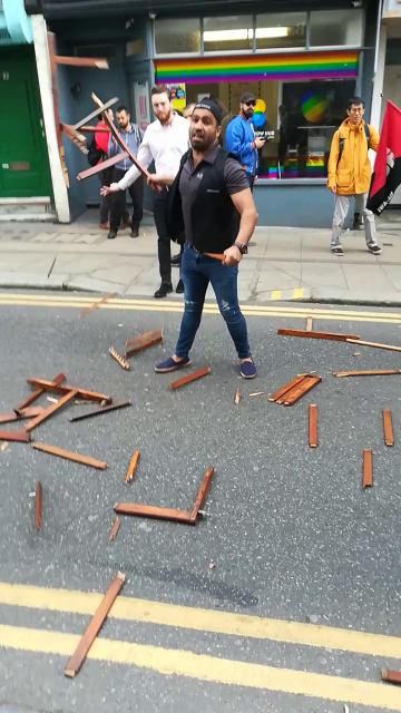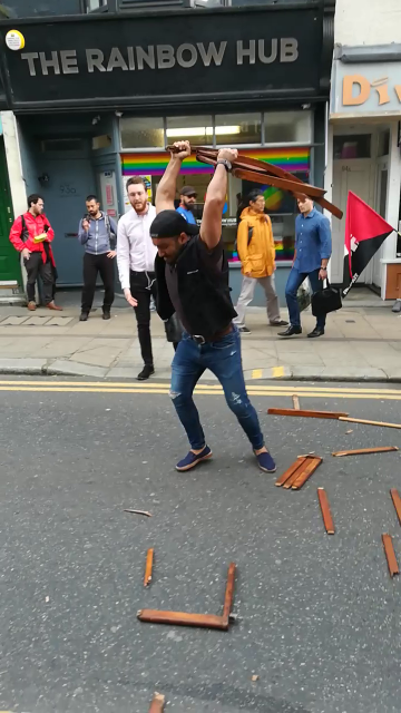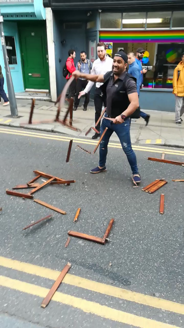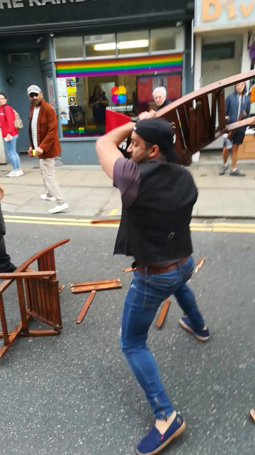 In a remarkable demonstration of aggression, the owner Hamid Karam and the manager Cyrus Shabani smashed up their own wooden chairs in the middle of the road, wielded the remains at picketers, pushed and hit multiple people, and choked one member before throwing him across the street in front of traffic. They also snatched members’ phones out of their hands as they were filming the disgusting behaviour, smashing one phone in the process.