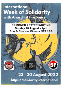 During Solidarity With Anarchist Prisoners Week, we are holding a prisoner letter-writing session on Sunday 28 August at 1pm. Come along and give practical support to comrades jailed for fighting against authoritarianism & repression. Free event & all materials provided. The cafe will be open for refreshments & delicious vegan treats. Child-friendly event with activities: colouring books, crayons etc. so please bring younger people along.