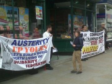Workfare campaigners staged a lively day of action in South London [on 19th May] following the call out from South London Solidarity Federation.